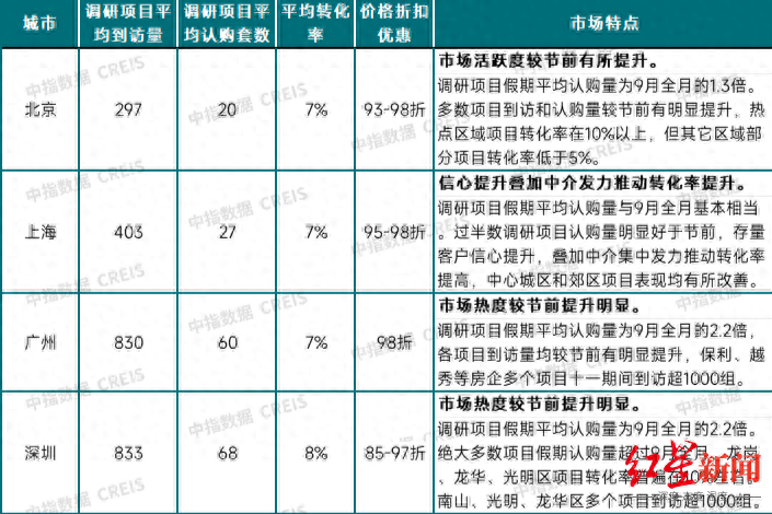 中指研究院数据显示,广州、深圳监测新房项目假期平均认购量达9月全月2倍水平,北京、上海超过9月全月认购量。一线城市除优质改善项目延续较好去化外,十一期间多个刚需楼盘销售也出现明显好转。