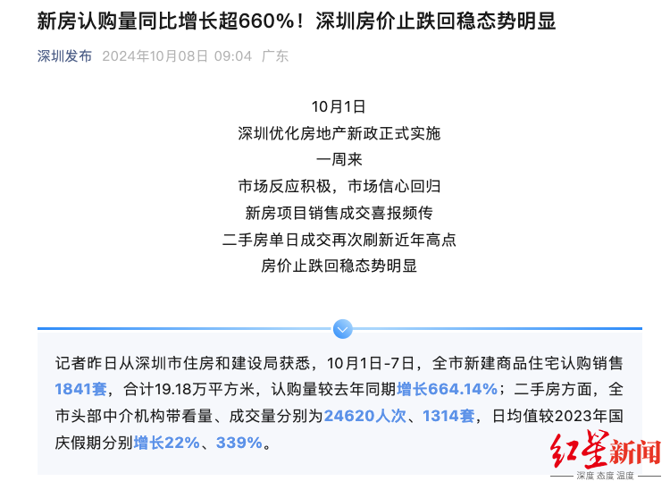 深圳发布消息,深圳新房认购量同比增长超660%