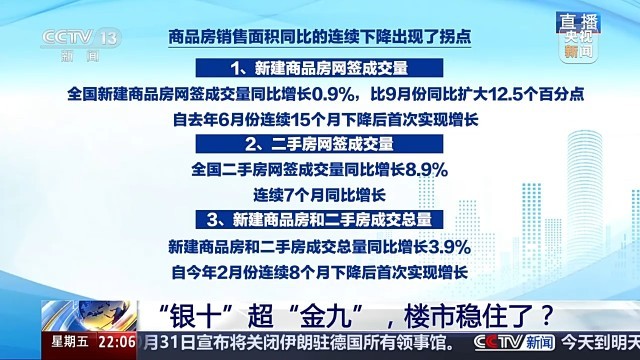 记者从住房城乡建设部获悉,10月份商品房成交同比、环比实现“双增长”,17年来首次楼市“银十”超“金九”。这个“银十”的成色究竟怎样?如何看待接下来的趋势?更好地促进房地产市场止跌回稳,一系列的政策措施又在怎样快速推进?一起关注→