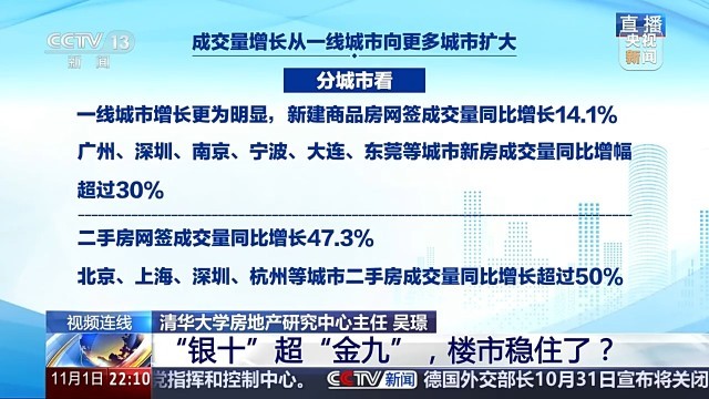 清华大学房地产研究中心主任 吴璟:房地产市场尤其是住房市场,有着很强的季节性,因此传统上很少会出现10月份的成交量超过9月份的情况。我觉得10月份的成交量出现环比增长,一方面当然是因为我们在过去一段时间里出台的很多具体的政策,释放了有针对性的特定需求,比如说一线城市限购政策的调整,甚至是取消,释放了部分此前没有资格购房人群的需求。首付款的下降,也帮助此前部分交不起首付款的,特别是年轻人能够开始购房。与此同时,我觉得同样重要的,甚至可能更重要的是,在9月26日的中央政治局会议明确提出了促进房地产市场止跌回稳,它释放出了一个非常强烈的政策信号,可以说在市场中起到了比较强的提振信心的作用。相当一部分改善需求,甚至是首次置业的家庭,此前可能因为信心不足,处于观望状态,这样的信号对于提振信心,释放这部分需求还是发挥了很大的作用。