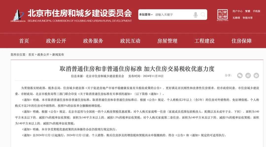 11月18日晚间,北京市住建委、北京市财政局、北京市税务局等三部门联合印发 《关于取消普通住房标准有关事项的通知》 ,取消普通住房和非普通住房标准。 取消普通住房和非普通住房标准后,个人将购买2年以上(含2年)的住房对外销售的,免征增值税,个人将购买不足2年的住房对外销售的,按照5%的征收率全额缴纳增值税。 通知自2024年12月1日起施行。