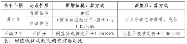 增值税方面,政策调整后个人将购买2年以上(含2年)的住房对外销售的,免征增值税;个人将购买不足2年的住房对外销售的,按照5%的征收率全额缴纳增值税。