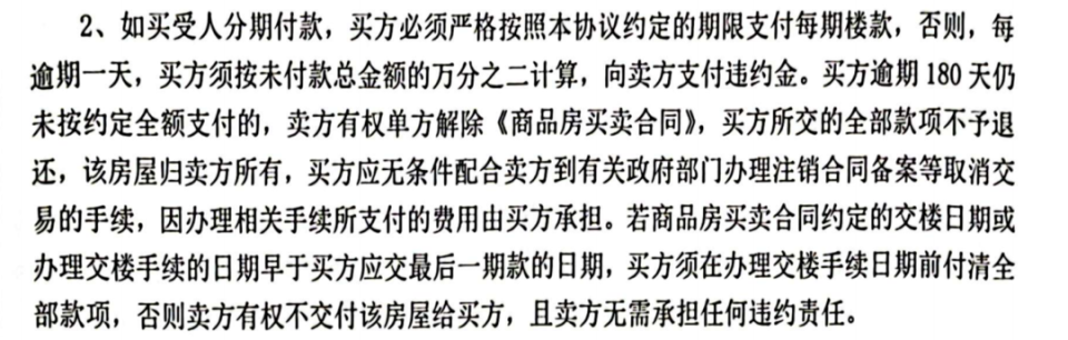 合同附后的补充协议约定,买房人逾期180天仍未按要求全额支付的,卖方有权单方面解除《商品房买卖合同》,所交全部款项不予退还,房屋归卖方所有,买房人无条件配合办理取消交易的手续,相关费用由买房人承担。