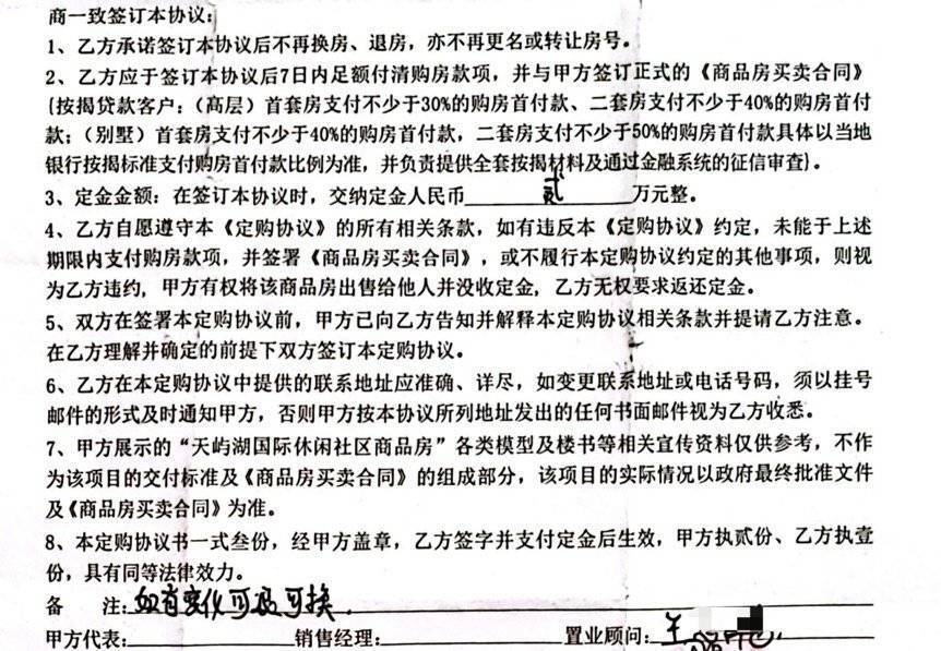 周女士提供资料显示,2021年5月3日,她与湖北天屿湖生态文旅有限公司签订《天屿湖国际休闲社区订购协议》。协议约定,买方承诺签订协议后不换房、退房,签订7日内足额付清购房款。协议在备注中注明“如有变化,可退可换”。