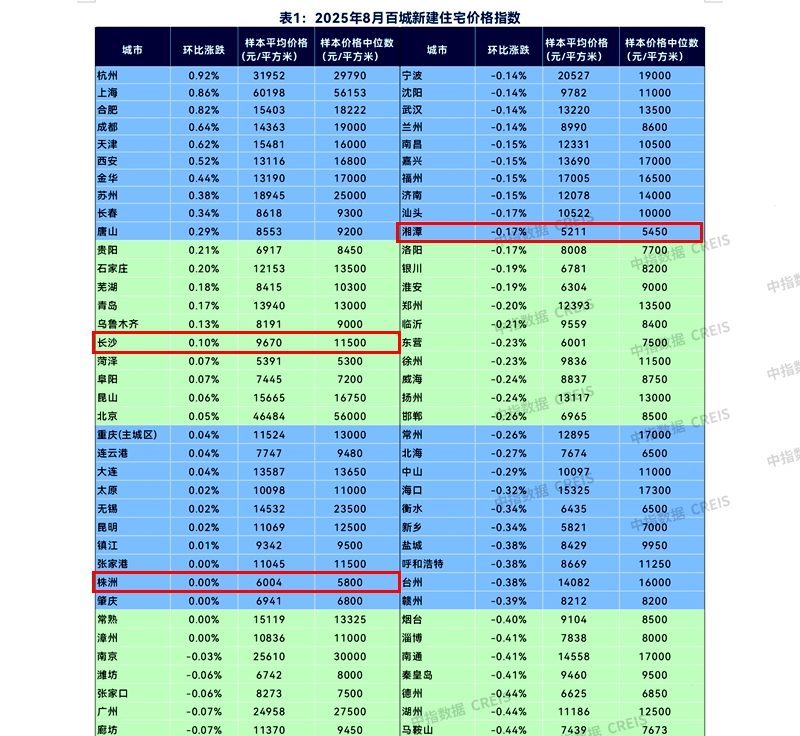 红网时刻新闻9月2日讯(记者 岳瑾)9月1日,中指研究院发布的2025年8月“百城价格指数”显示,全国100个城市新建住宅平均价格为16910元/平方米,环比上涨0.20%。其中,长沙市(注:文中统计数据所表述长沙市的统计范围为市内六区+三市县)新建住宅均价为9670元/平方米,环比上涨0.10%。