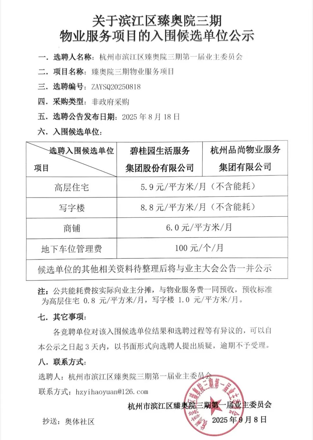 9月8日,业委会公示了臻奥院三期物业选聘最终入围的2家候选单位,分别是碧桂园物业和品尚物业,两家公司的物业费报价跟之前滨江物业服务期间的收费标准一致,即高层住宅物业费为5.9元/平方米/月,另外公共能耗费为0.8元/平方米/月。
