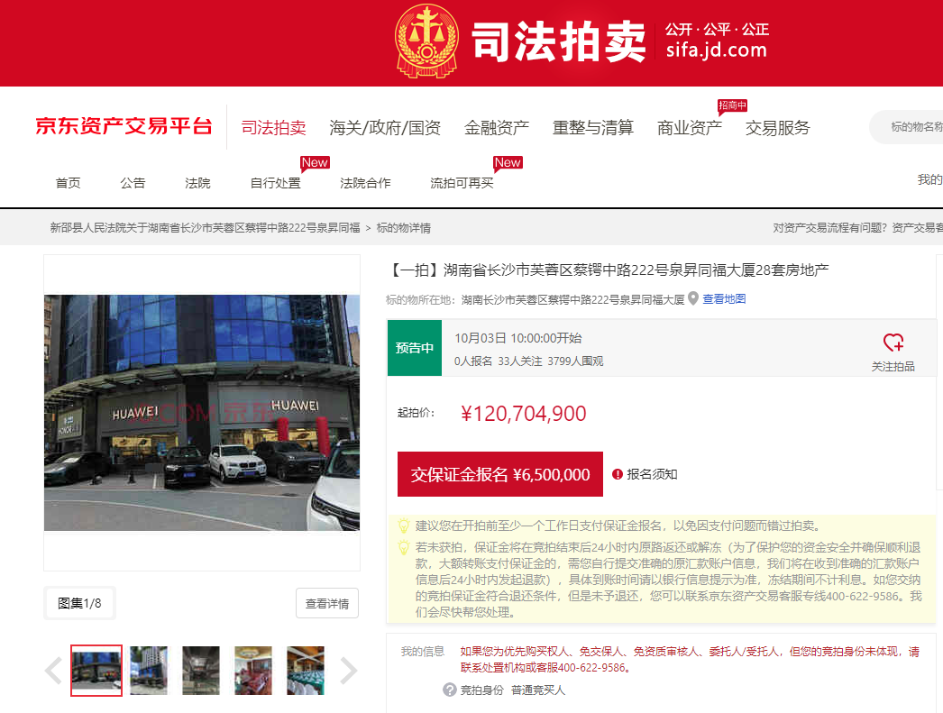 近日,位于蔡锷中路的泉昇同福大厦28套房产在京东资产交易平台挂牌,起拍价为1.2亿。截至记者发稿,该标的吸引了超3千人围观,将于10月3日上午10点开始拍卖。