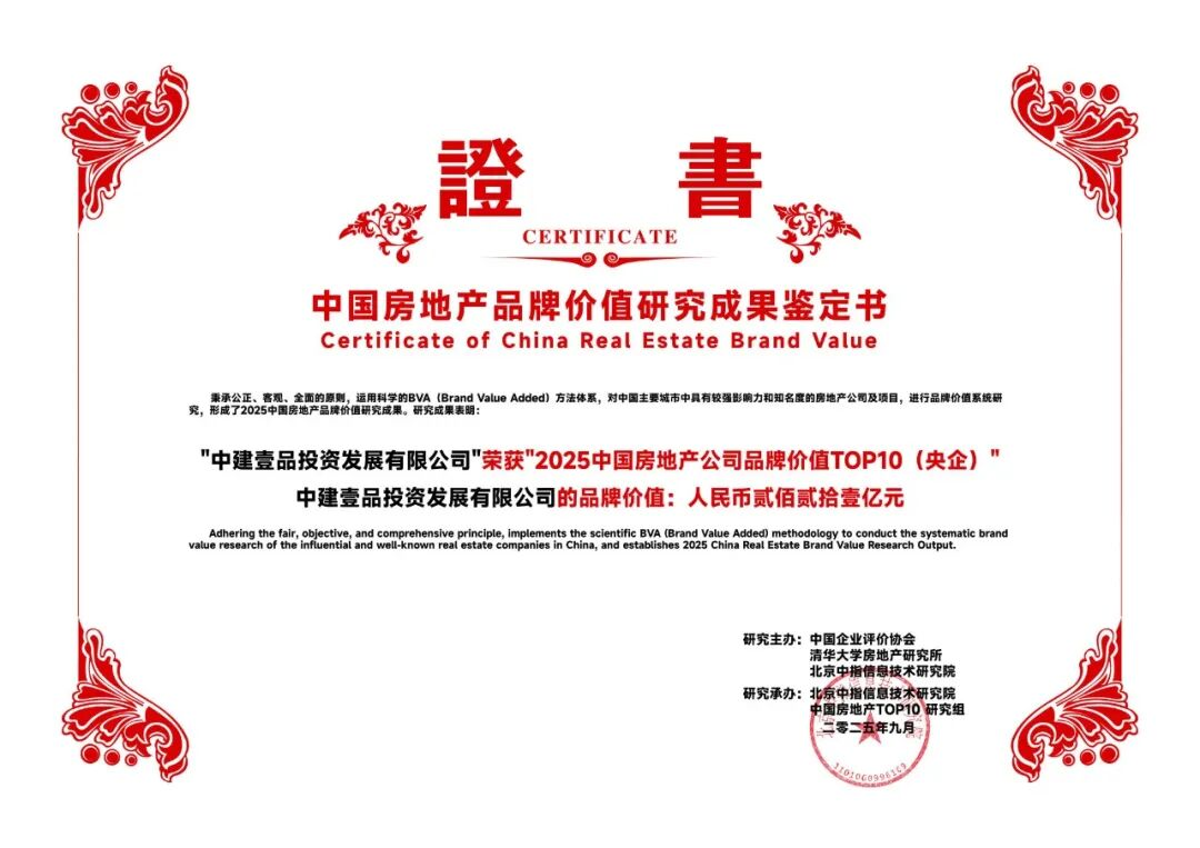 中建壹品荣登2025中国房地产公司品牌价值TOP10(央企),品牌价值221亿元 ,位列榜单第7名,荣膺2025中国房地产公司品牌价值TOP30。
