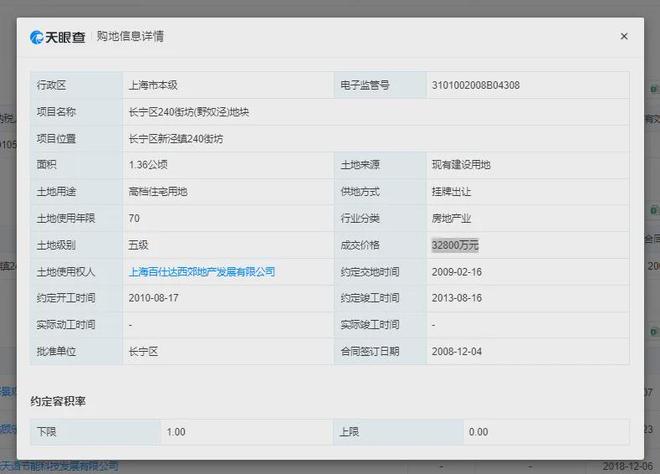 据天眼查,百仕达确实通过挂牌出让方式,以3.28亿元购入了长宁区新泾镇240街坊地块土地使用权,合同签订日期为2008年12月4日。