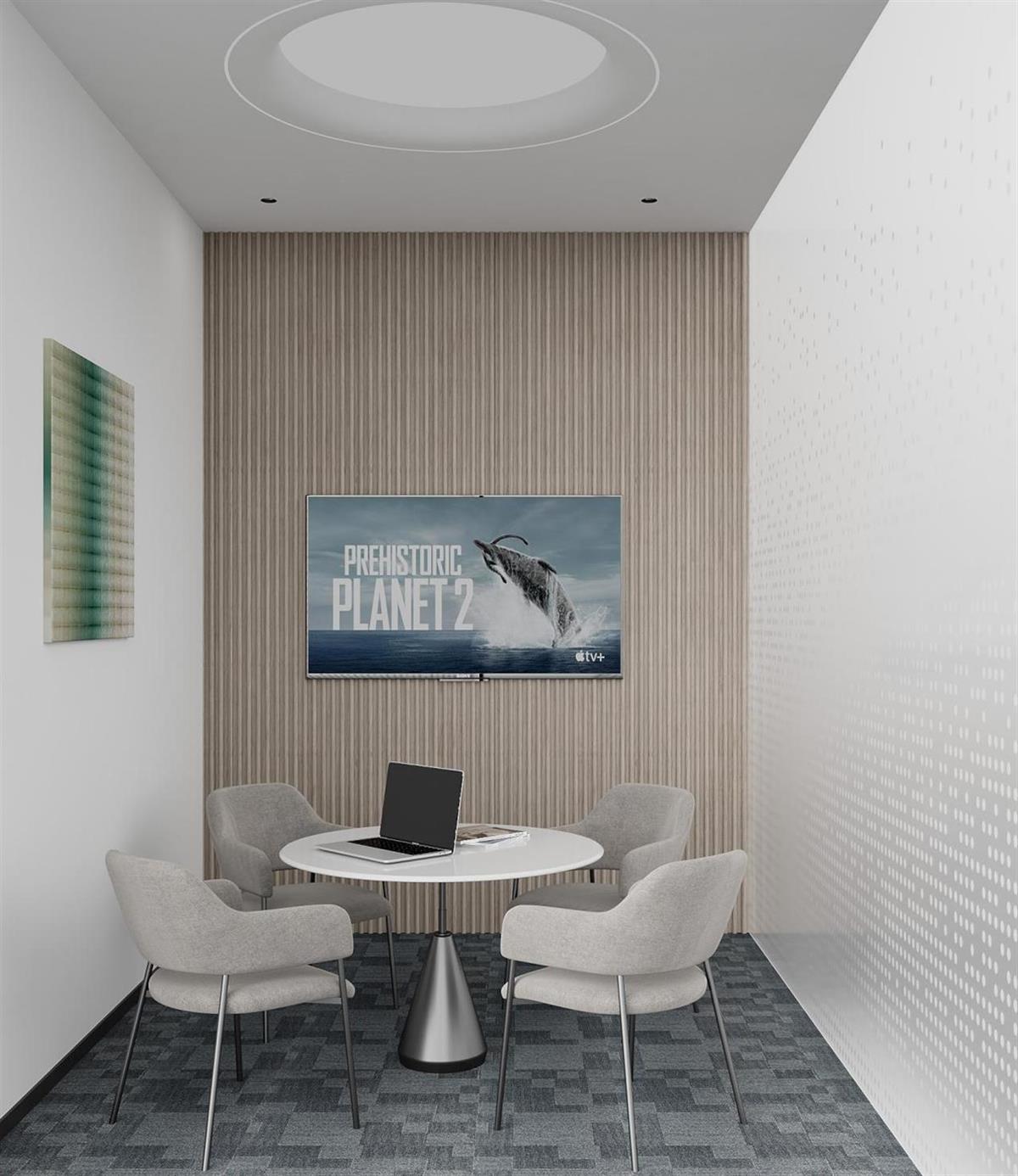 延续现代简约+轻商务的理念,摒弃冗余装饰,以“简洁线条、通透质感、实用美学”为核心,打造兼具专业感与舒适感的办公会议场景,契合科技型、创新型企业的品牌气质。以高级白(墙面、顶面)为基底,搭配深灰几何纹地毯,营造冷静、理性的思考氛围,同时通过色彩对比强化空间层次感。座椅选用暖棕色皮革,中和冷色调的距离感,传递温暖、亲和的情绪;会议桌与部分家具的银白质感,则提升了科技感与精致度,呼应现代办公的高效属性。
