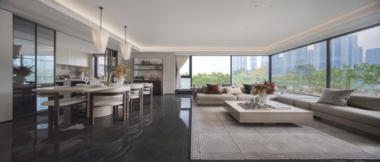 延续一期“有氧律动、逐梦空间、会客雅集”的泛会所理念,二期首层架空设计,全景落地窗引景入室,融合太太的会客厅、运动元气场、儿童成长盒子等多功能于一体,实现与生活的无界对话,构筑全龄开放、自然、品质、关怀的社区场域,重新定义塔尖圈层的社交方式。