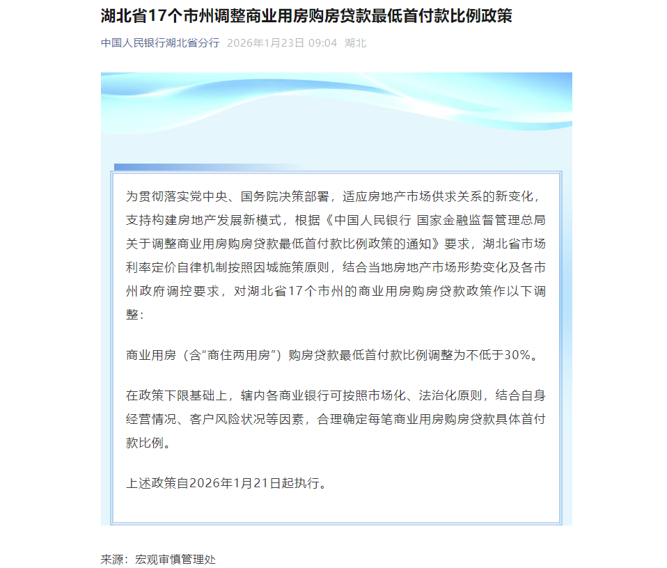 湖北日报讯(记者胡祎)1月23日,中国人民银行湖北省分行官方微信发布消息,为贯彻落实党中央、国务院决策部署,适应房地产市场供求关系的新变化,支持构建房地产发展新模式,根据《中国人民银行 国家金融监督管理总局关于调整商业用房购房贷款最低首付款比例政策的通知》要求,湖北省市场利率定价自律机制按照因城施策原则,结合当地房地产市场形势变化及各市州政府调控要求,对湖北省17个市州的商业用房购房贷款政策作以下调整: