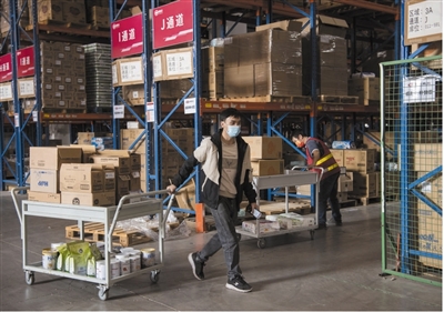 近日,在浙江省金华市金义综合保税区仓库内,跨境电商工作人员正在分拣商品。时宽兵摄(人民视觉)