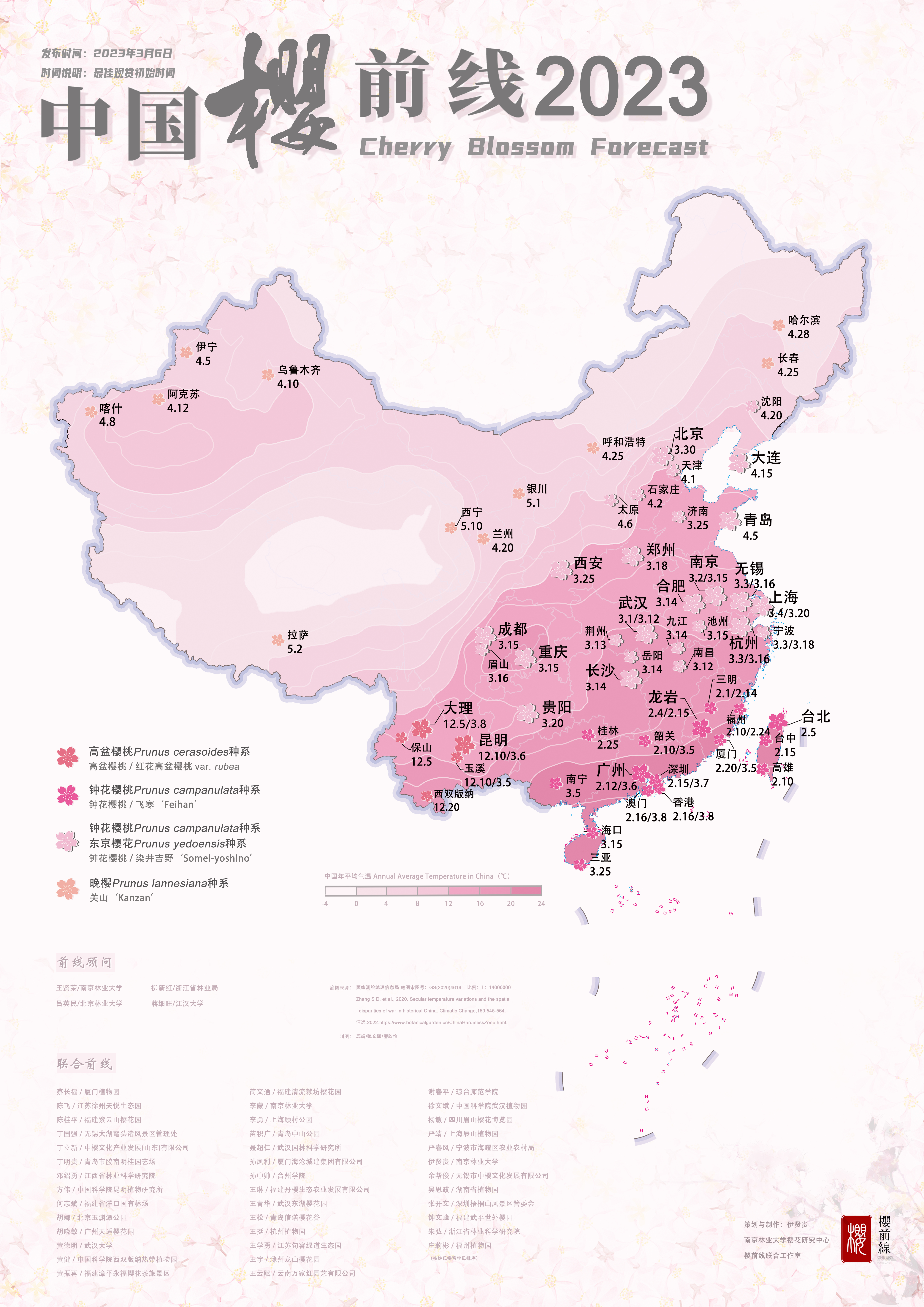 交汇点讯“樱花红陌上,杨柳绿池边”,又是一年春和景明时,全国各地陆续进入踏春赏樱季。今年哪里的樱花会最早绽放?樱花到底起源何处?近日,由南京林业大学樱花研究中心主编的系列科普报告——《中国樱前线2023》正式发布。该报告基于对环境因子的响应机理建立了模拟植物生长发育的科学模型,以图文并茂的形式对中国主要赏樱区的最佳观花期进行了科学预判,同时对樱花的种类资源、品种资源、樱花起源等进行了较为详尽的考证。