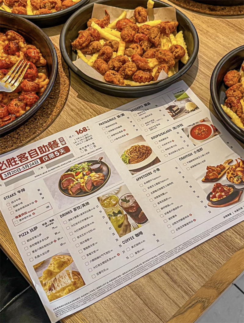 如果说以上的餐饮企业只是短暂试水,那么接下来的几家餐饮企业,可以说是在限时自助中尝到了甜头。首当其冲的就是披萨界的“扛把子”——必胜客,相较于其他品牌在浅尝辄止后便下架了“自助类产品”,必胜客的限时自助却已经连续举办了好几年。花费168元/位的价格,就可以畅享40种美食,甚至还包含了惠灵顿牛排。每年一次的限时回归,引得一众食客蜂拥而至,有的美食博主甚至还会广而告之。