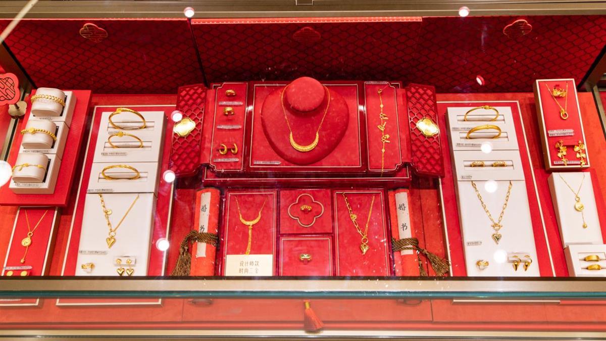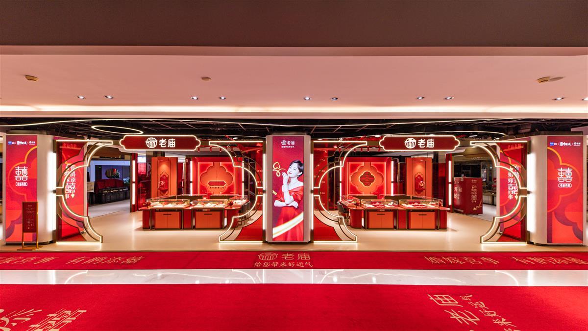 “老庙心囍节”老庙有鹊武汉七夕快闪店以新中式婚嫁氛围打造,店内以红色调为主,辅以金色点缀,整个快闪店以受到年轻人欢迎的国潮婚礼元素搭建,店内更是铺设有老庙有鹊系列等适合婚嫁场景佩戴的产品,为现场嘉宾和观众带来沉浸式购物场景新体验。