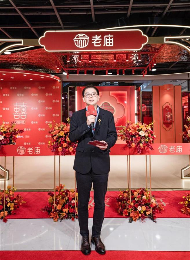 “中国囍”的概念取自中国传统喜事文化中的“囍”。“囍”意为“双喜”,常用于婚礼场景中,以红纸剪制而成,或写在红纸上,贴于门窗堂壁。作为婚礼当天必不可少的装饰,“囍”也象征着对新婚夫妇婚姻幸福与美满的加倍祝福。而“老庙心囍节”,既承载了多年来老庙“好运”文化中关于喜事分支的内核,也面向年轻消费者传达了老庙对于新中式婚礼的创新解读。