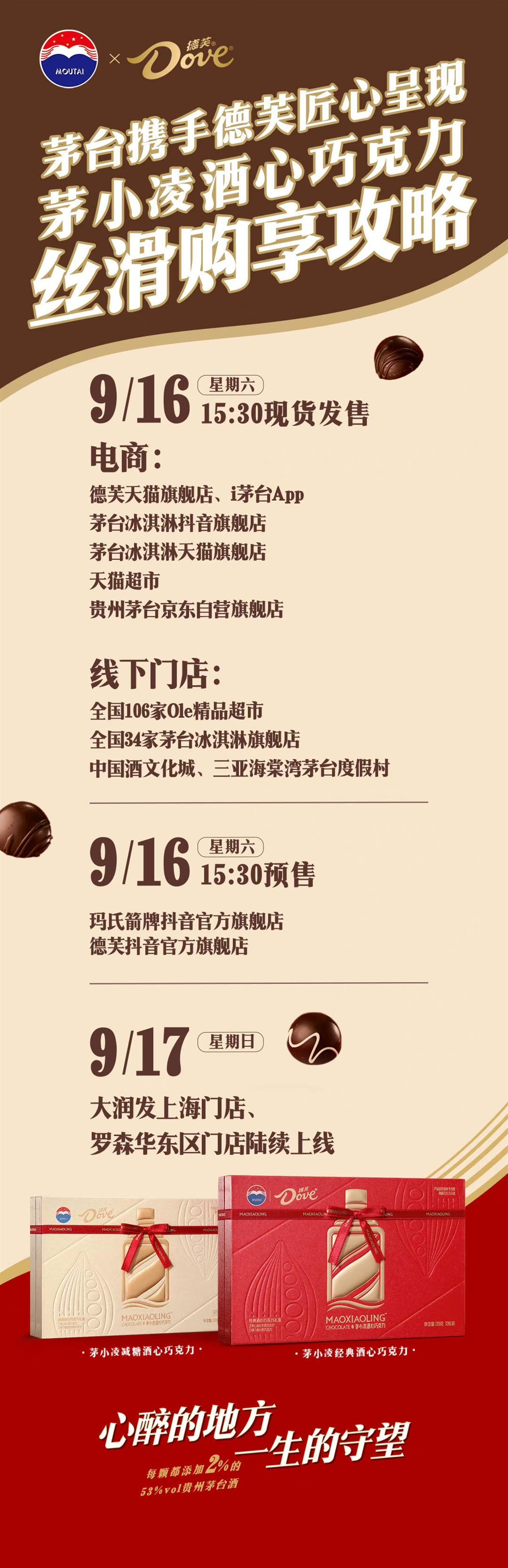 9月15日,极目新闻记者在贵州茅台官方微博看到,此款巧克力命名为“茅小凌酒心巧克力”,每颗巧克力都添加2%的53度贵州茅台酒,包括经典、减糖两种口味,规格分别是2粒20g,12粒120g。9月16日15:30,将在i茅台App、茅台冰淇淋抖音、天猫旗舰店、贵州茅台京东自营旗舰店、天猫超市、德芙天猫旗舰店、全国34家茅台冰淇淋旗舰店、中国酒文化城、全国106家Ole精品超市、三亚海棠湾茅台度假村限量发售,后续还将在大润发上海门店、罗森华东区门店陆续上线。