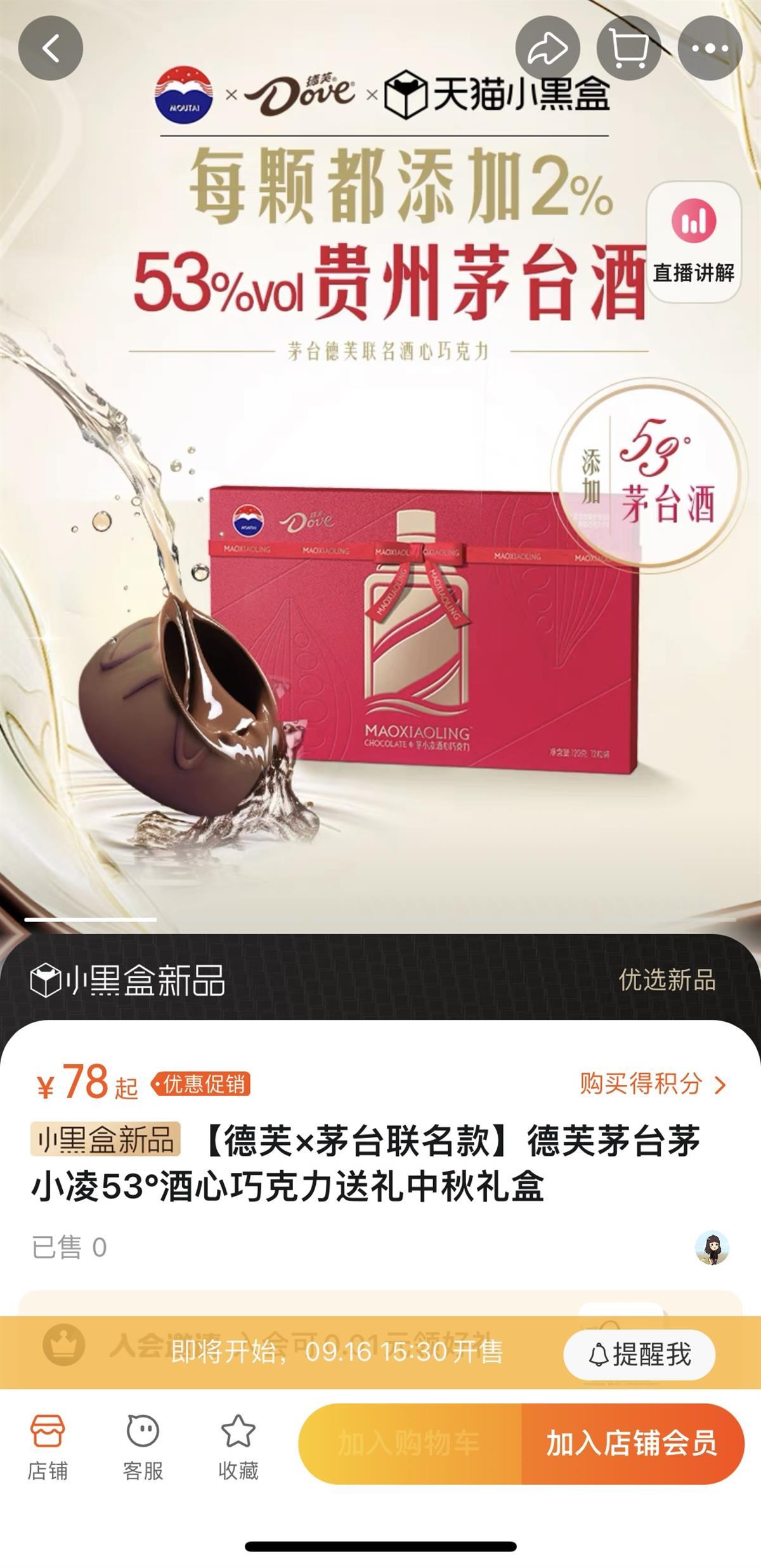 记者在德芙天猫旗舰店看到,“茅小凌酒心巧克力送礼中秋礼盒”页面已经上线,但在16日下午3点半之后才能进行购买,经典酒心巧克力礼盒2粒2盒装、12粒装,价格分别为78元、169元;减糖酒心巧克力礼盒12粒装,售价179元。