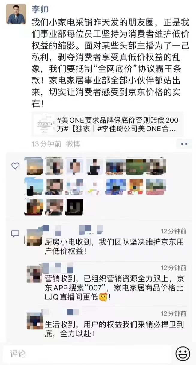 10月25日,京东家电家具负责人李帅发朋友圈呼吁:“某些头部主播为了一己私利,剥夺消费者享受真低价权益的乱象,我们要抵制全网底价协议的霸王条款。”