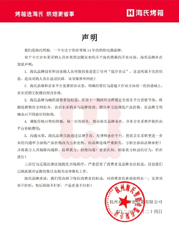 海氏烤箱表示,调低价格出售的烤箱,所有损失均由品牌方承担,并非京东采销称的由平台补贴费用。在沟通未果后,海氏只能法律手段发律师函给平台,京东采销更进一步未经沟通单方面将产品价格改为五折出售,给品牌造成严重损失。