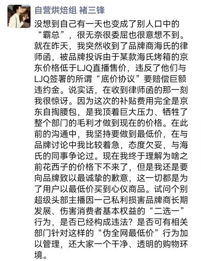 10月24日,此事被京东采销人员发至朋友圈,称京东收到海氏律师函,被投诉由于某款海氏烤箱的京东价格低于李佳琦直播售价,违反他们与李佳琦签署的“底价协议”,并要求赔偿巨额违约金。