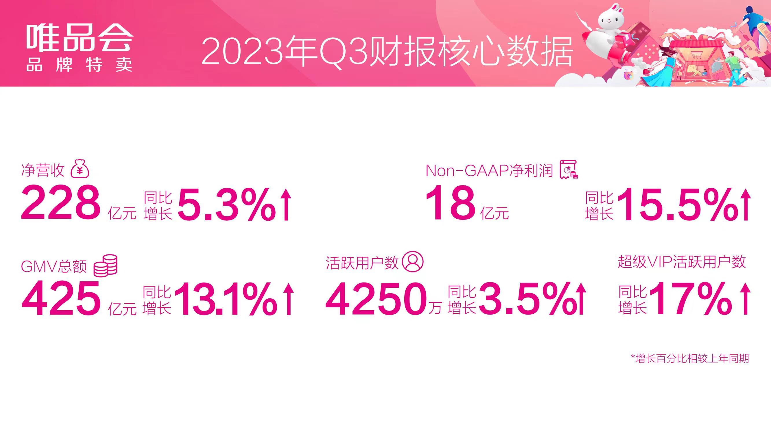 近日,唯品会(vip.com,NYSE:VIPS)发布2023年第三季度财报,财报显示,唯品会三季度实现净营收228亿元(人民币,下同),同比增长5.3%;Non-GAAP净利润18亿元,同比增长15.5%,营收、净利润双增长。