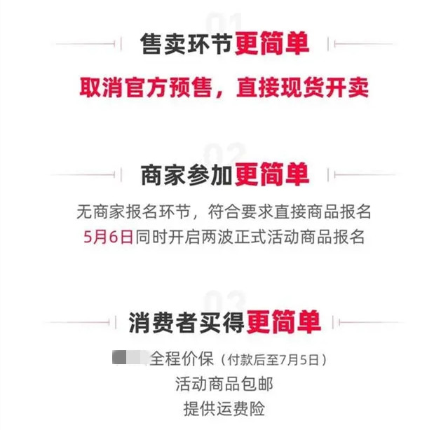在京东618商家生态伙伴大会上,京东方面也公布了大促节奏并表示,今年京东“618”取消预售期,将在5月31日晚8点直接进入开门红阶段进行现货售卖。开门红之后为专场期、高潮期和返场期。