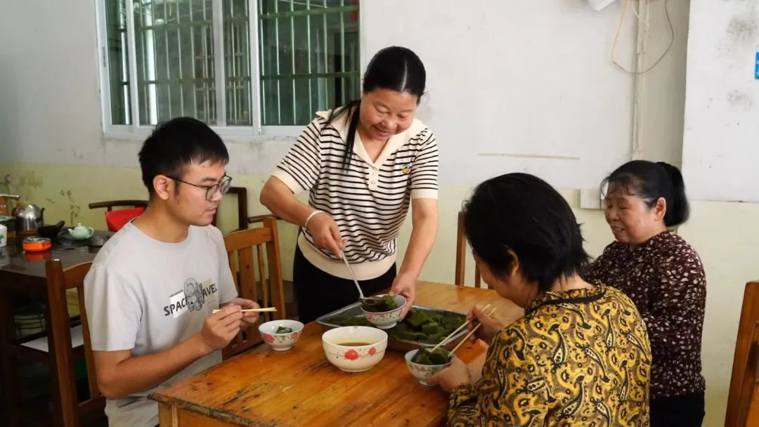 在当地,每年农历的四月至六月,仙人草开始进入旺盛生长的季节,勤劳质朴的客家人就会结伴来到田野间,收割新鲜嫩绿的仙人草用来制作仙人粄。一碗美味的仙人粄是如何制作的呢?记者看到,村民们先把洗净后的仙人草放入锅中熬煮,火候到一定程度时,将草渍捞起,再将仙人草汤过滤,然后倒入适量米浆,并加热不断搅拌,待汤液变成糊状后即倒入盆内冷却,便成了仙人粄,整个过程看似简单,但却非常考验耐心、细心。