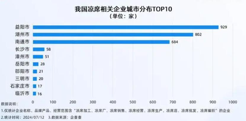 很多湖南人不知道,说到凉席,国内靠前的产地实际上就在湖南。企查查数据显示,国内现存凉席相关企业3140家。从区域分布来看,凉席相关企业地域性较强,多聚集在湖南、浙江、江苏三地。从城市来看,益阳以929家相关企业,占全国存量近三成,居全国第一。湖州、南通分别现存802家、684家,居全国前三,领先其他城市。此后是长沙、漳州等地。