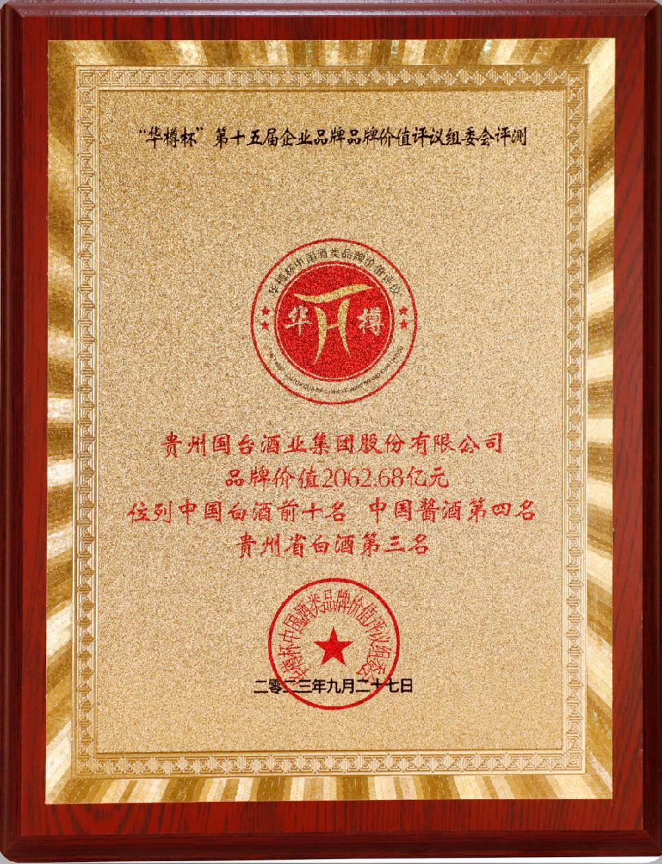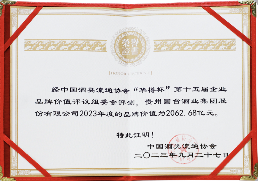 长年以来,国台无论从销售规模、品牌价值、纳税额等方面,综合实力都稳居贵州白酒前三。最新权威数据显示:2023年9月,经中国酒类流通协会“华樽杯”第十五届企业品牌价值评议组委会评测,国台以2062.68亿元的品牌价值,蝉联中国白酒第十名、贵州白酒第三名。