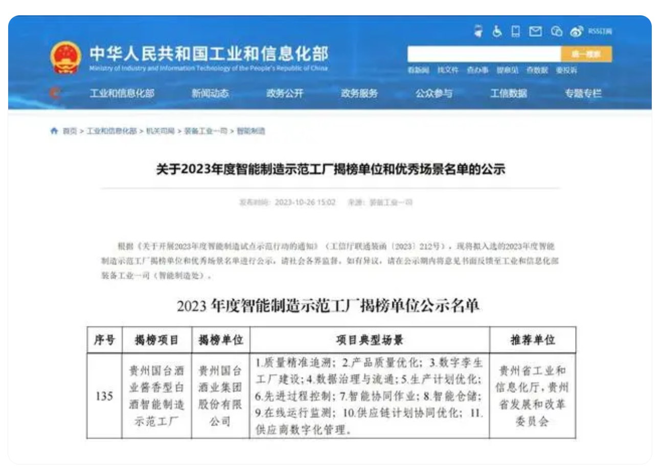 2023年11月24日,工业和信息化部等五部门公布了2023年度智能制造示范工厂揭榜单位和优秀场景名单,国台获评“2023年度智能制造示范工厂”揭榜单位,成为贵州白酒首家国家级智能制造示范工厂。