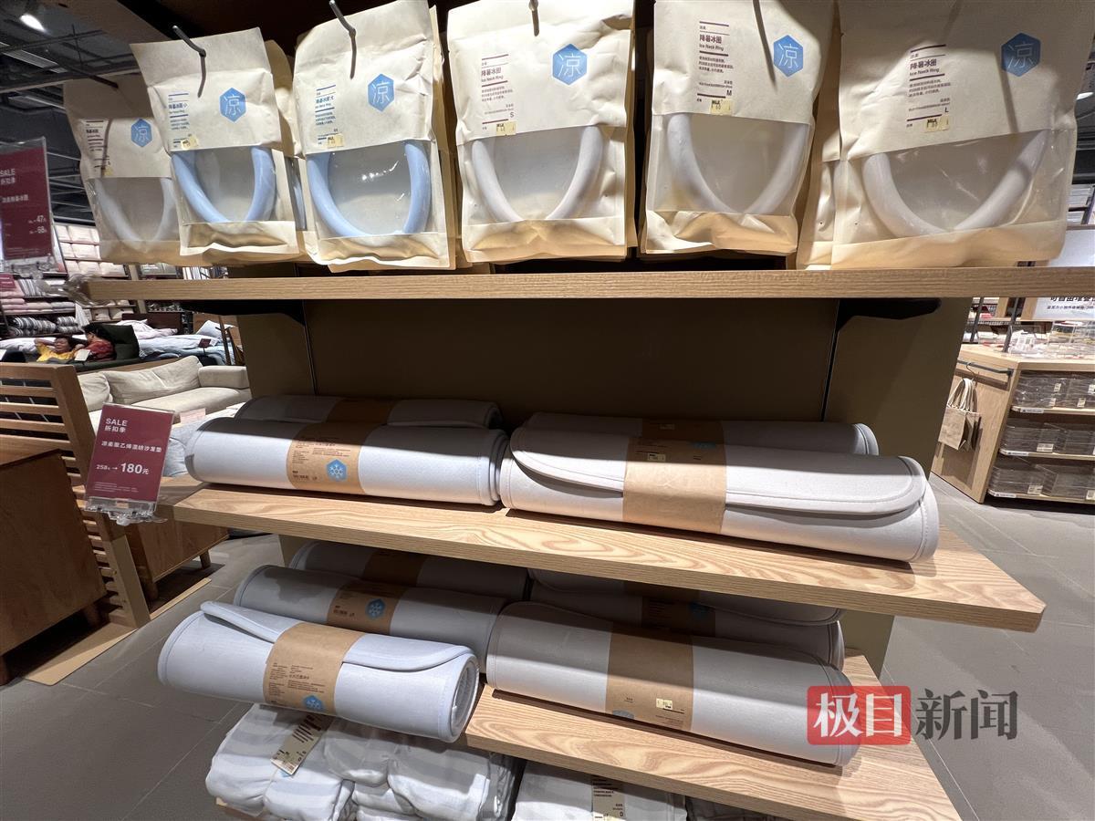 7月24日,极目新闻记者在武汉走访发现,降暑冰圈、清凉喷雾、降温湿巾等新式降温产品琳琅满目,这些产品往脖子上一戴、往衣服上一喷、往身上一擦,就能瞬感清凉。冰丝凉席、乳胶凉席等新式凉席则代替藤席、竹席、麻将席等传统凉席,成为夏季清凉床品新宠。