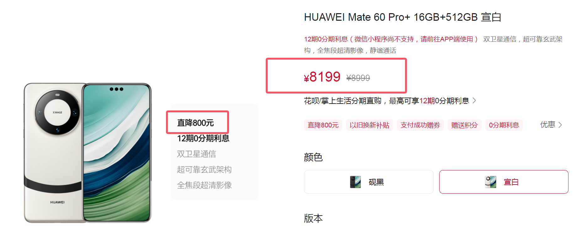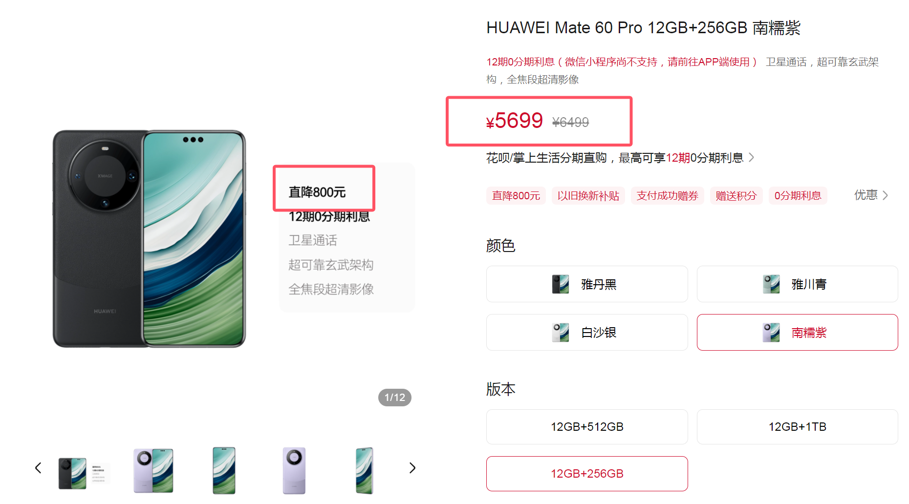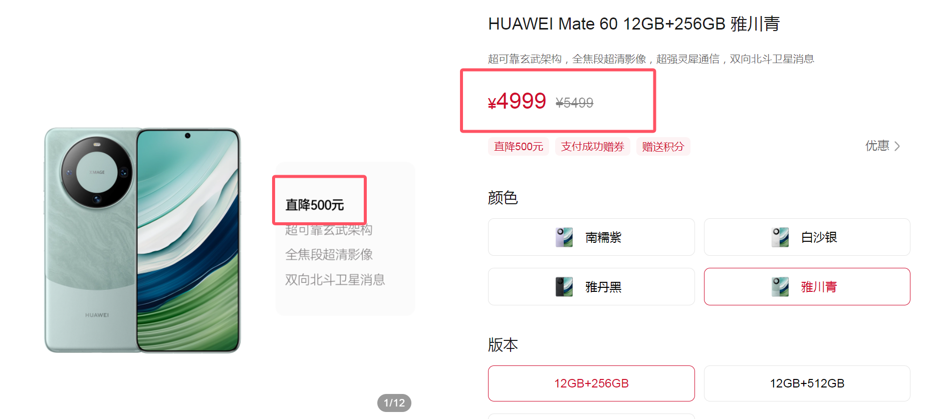 从华为商城看,华为Mate 60售价4999元起,降价500元。