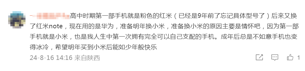 “高中时期第一部手机就是粉色的红米(已经是9年前了忘记具体型号了)后来又换了红米note,现在用的是华为,准备明年换小米,准备换小米的原因主要是情怀吧,因为第一部手机就是小米,也是我人生中第一次拥有完全可以自己支配的手机。成年后总是不如意,手机也变得冰冷,希望明年买到小米后能如少年般快乐。”