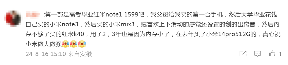 “第一部是高考毕业红米note1,1599吧,我父母给我买的第一台手机,然后大学毕业花钱自己买的小米note3,然后买的小米mix3,贼喜欢上下滑动的感觉还设置的剑的出窍音,然后内存不够了买的红米k40,用了2,3年也是因为内存小了,在去年买了小米14pro512G的,真心祝小米做大做强。”
