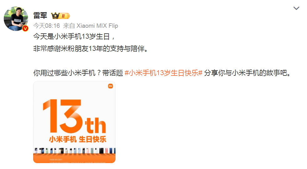 今天是小米手机13岁生日