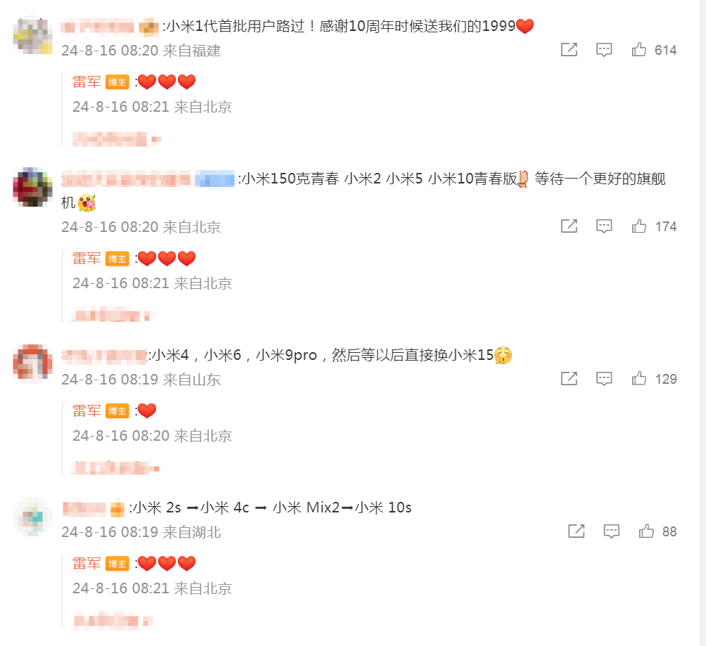 前排也被雷军一一比心回复