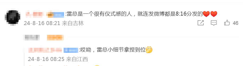 有网友注意到,雷军的发文时刻是8点16分