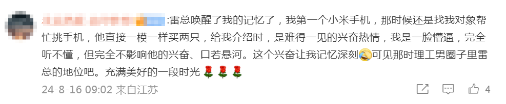 “雷总唤醒了我的记忆了,我第一个小米手机,那时候还是找我对象帮忙挑手机,他直接一模一样买两只,给我介绍时,是难得一见的兴奋热情,我是一脸蒙,完全听不懂,但完全不影响他的兴奋、口若悬河。这个兴奋让我记忆深刻,可见那时理工男圈子里雷总的地位吧。充满美好的一段时光。”