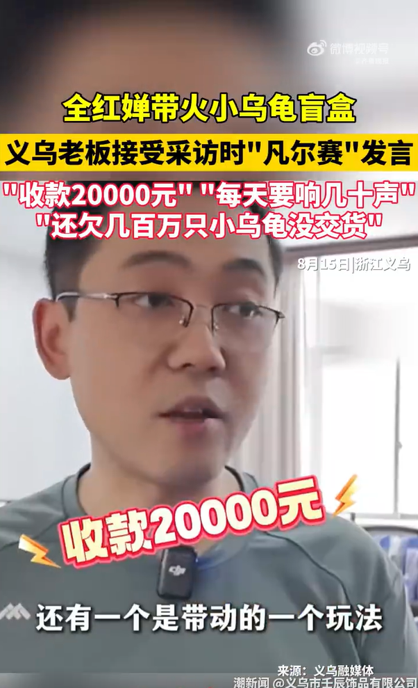 关于乌龟挂饰的高度讨论,则源于奥运跳水冠军全红婵带火了“乌龟对对碰”盲盒玩法。近日义乌生产“小乌龟”的厂长在接受记者采访时,手机不时响起“收款20000元”的提醒。厂长表示,这样的提醒每天会响起个几十声,最近每天只睡三四个小时,只为按时交付小乌龟。