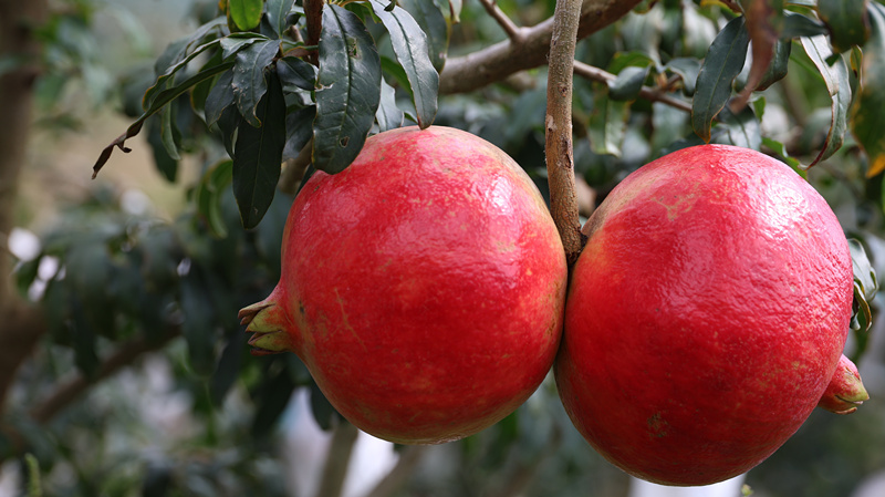 在永康镇端德村“黑美人”石榴种植基地,石榴树枝头挂满了已穿上“新衣”的石榴,工人们正忙着对剩余石榴进行套袋,通过套袋有效提高成果品相,降低病虫害侵扰。