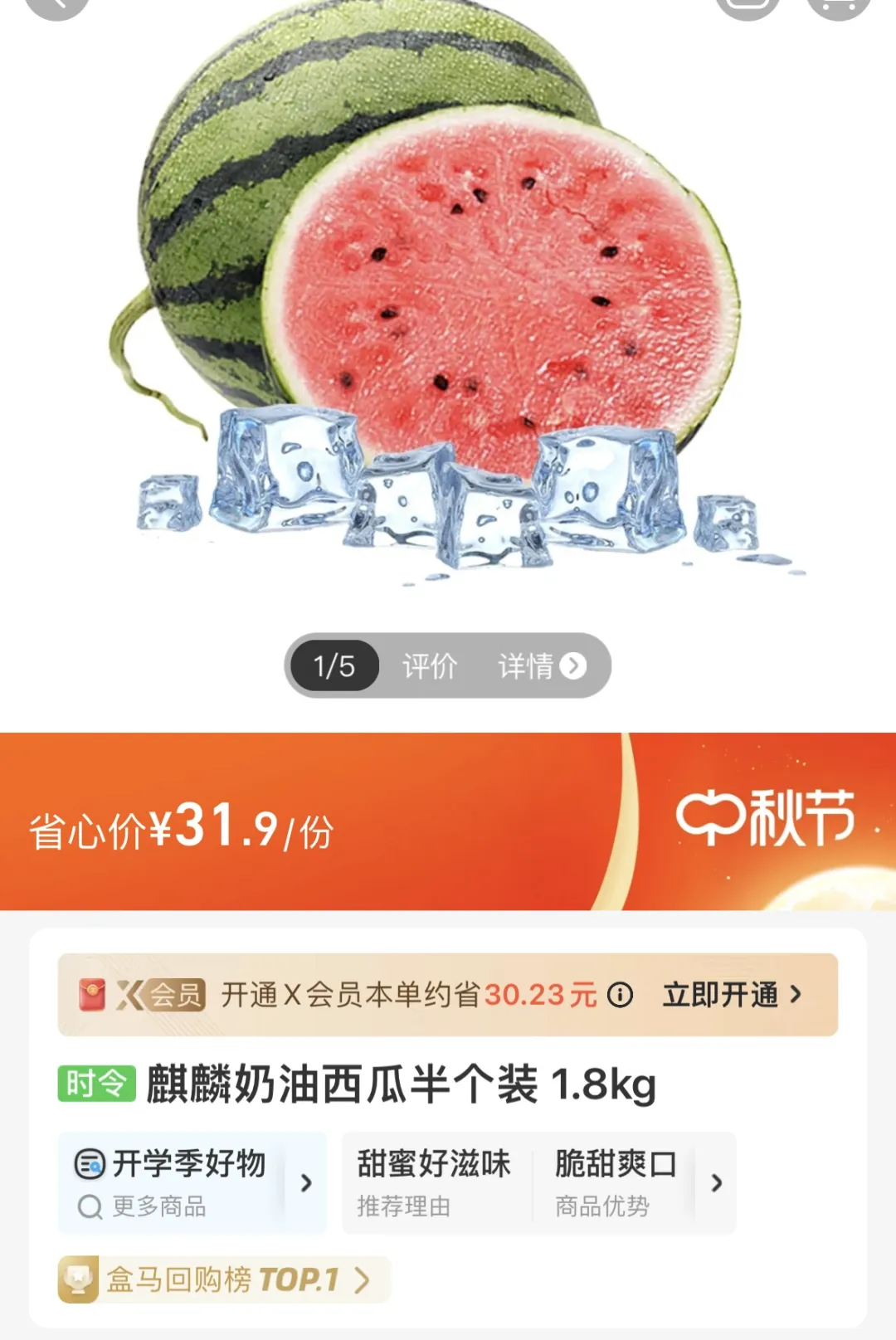 盒马上回购第一的麒麟奶油西瓜半个装也要31.9元,一个算起来也要60多元了。