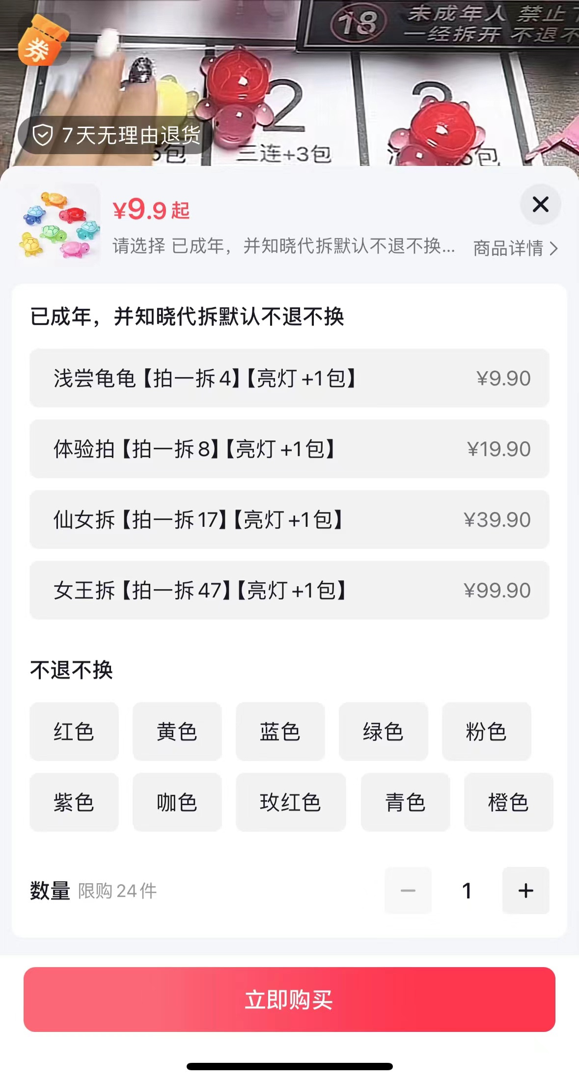 消费者需先购买数包盲袋并许愿一种颜色,卖家一般会挂出几种“套餐”,如9.9元拆4包,19.9元拆8包等套餐。消费者在直播间下单后,如主播现场拆出的乌龟颜色与买家许愿的颜色一致,或拆出两只相同颜色的乌龟,主播会额外加拆一包。