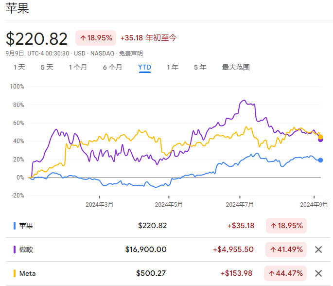 而从股价表现来看,苹果年初至今的累计涨幅(18.95%)远远落后于微软(41.49%)和Meta(44.47%)。