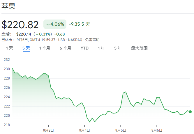 在苹果发布会之前,其股价也表现平平——上周(9月2日~7日)苹果累计下跌4.06%,相比之下,标普500指数上周的累计跌幅为3.64%,道指的累计跌幅为2.47%。
