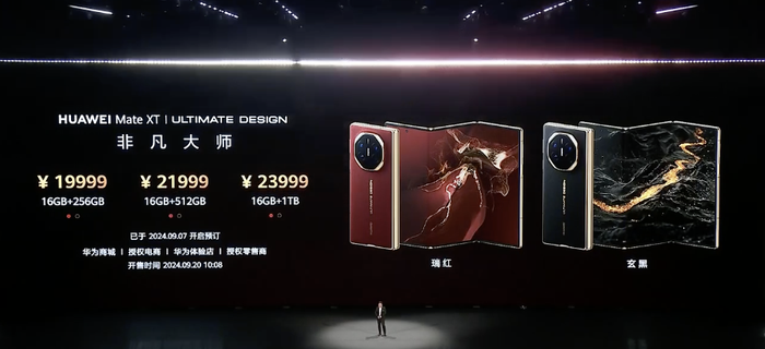 9月10日,华为三折叠屏手机Mate XT非凡大师正式发布,售价19999元起,产品将于9月20日10:08正式开售。