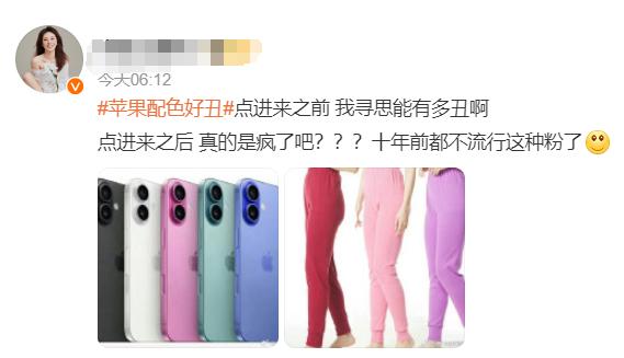 此外,最新发布的iPhone16的五种颜色被网友吐槽像秋裤和垃圾袋,#苹果配色好丑##苹果秋裤配色#等话题一度冲上热搜,有网友调侃“好廉价的颜色”“还是15的配色好看点”,有网友表示“丑不丑的没所谓,反正都要来个手机壳”。