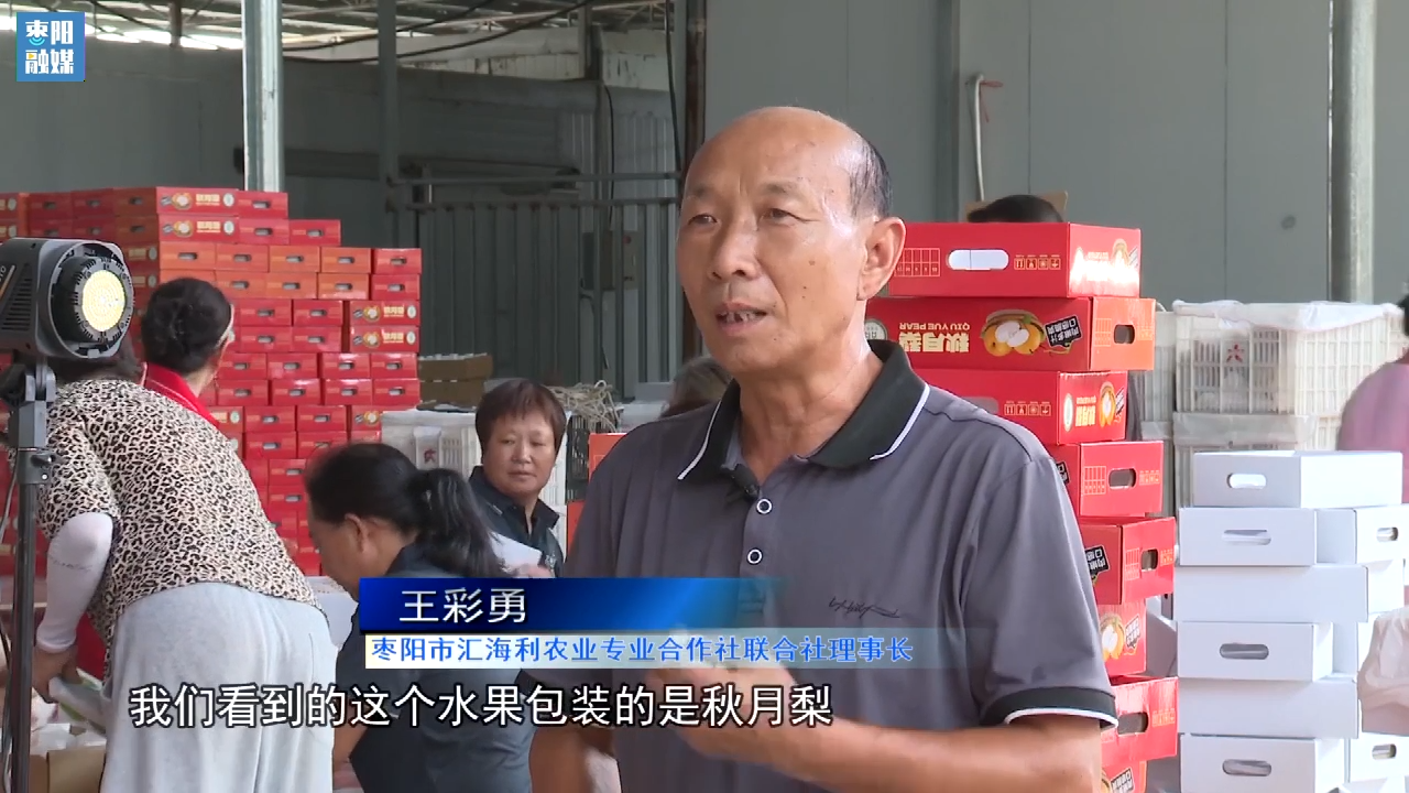 枣阳市汇海利农业专业合作社联合社理事长 王彩勇:我们看到的这个水果包装的是秋月梨,我们这个产品走高端市场,主要供应南方市场和沿海城市,还向港澳地区供应。