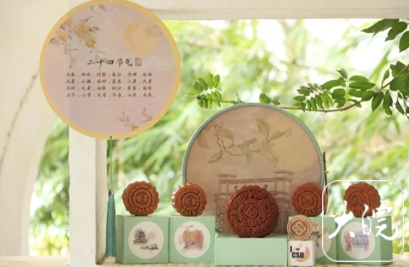中南大学定制版月饼推出两个系列礼盒和两款单品,其中凝香圆月系列礼盒为新中式手绘设计风格,月饼礼盒分上下两层,首层有1枚PLUS版双黄莲蓉月饼,印有中南大学校徽校训和玉兔祥云等,礼盒一角藏有一枚木质扩香器,还有二十四节气小挂件。